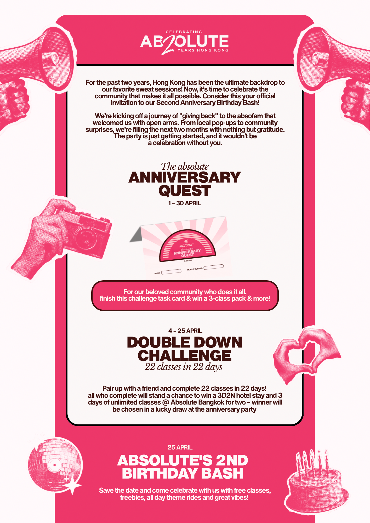 *For example: Sam has a 20 class pack. She will be eligible to these perks if she renews her package with at least 6 classes left in her current package. Renewal perks apply for Absolute Boutique Fitness and The Reformer Society packages.